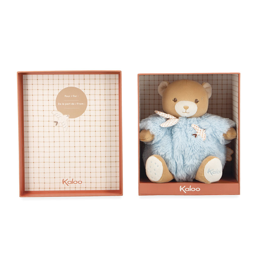 The Timeless Blue Bear embodies the gentle spirit and style of Kaloo's classic collections, and is perfectly sized for tiny hands to hold and love. Offering unparalleled softness, it is made from 95% recycled fabrics, including faux fur, micro-velvet and poplin, and filled with eco-friendly stuffing from recycled plastic bottles.