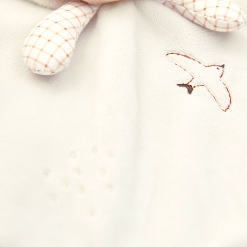 With a sweet rabbit face, gingham accents, and a delicate embroidered swallow motif, this timeless comforter is designed to soothe and engage. Made with care from 86% recycled materials - including micro-velvet, poplin, and recycled polyester stuffing.