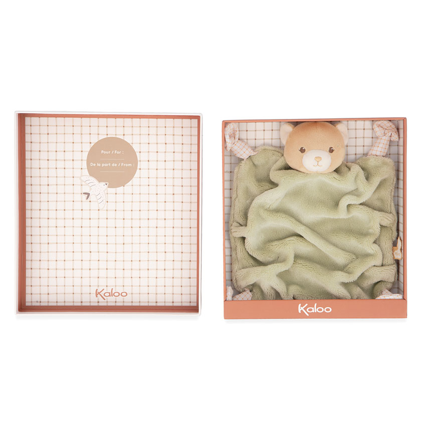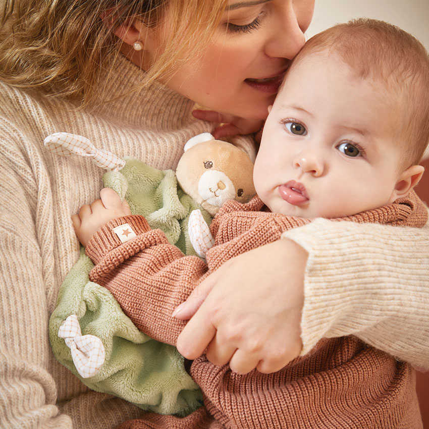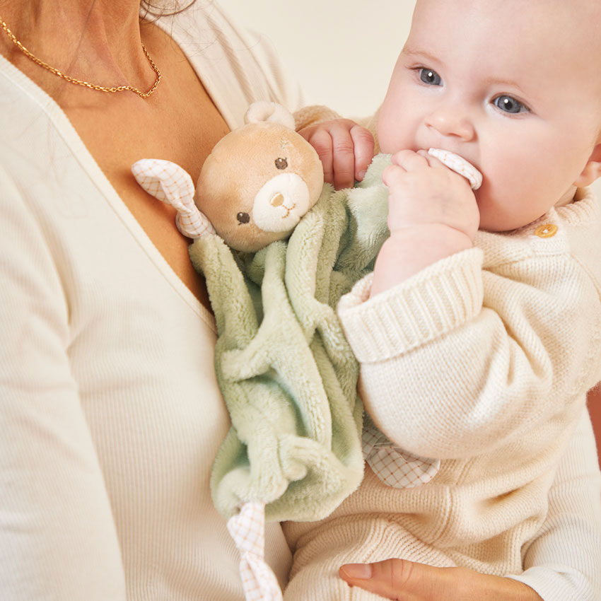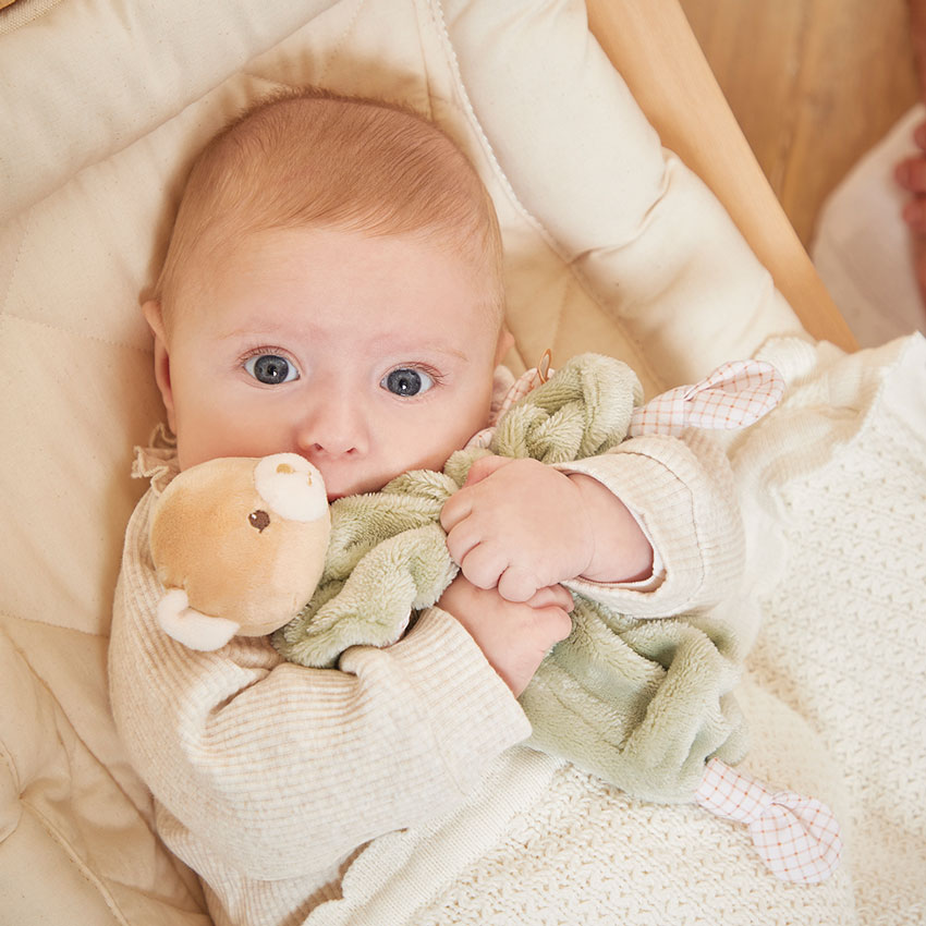 The Timeless Doudou Bear in Green is a traditional comforter designed with thoughtful details. Its soft, knotted limbs can be used to attach a pacifier or serve as easy handholds for little hands. The bear's sweet caramel face and gingham print accents add a classic charm, while gentle folds in the tummy create a snuggly texture that encourages sensory exploration.